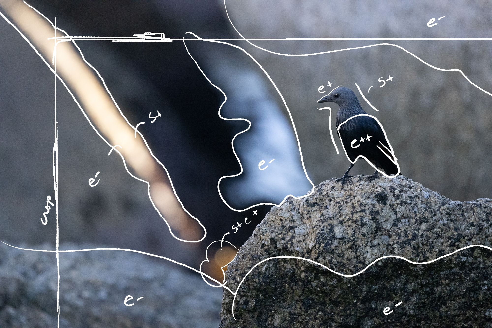 - Elements that are less prominent that my memory. I might raise the exposure or saturation to elevate their prominence. (e+, s+). This includes the starling’s head, belly, and red wing feathers and the bokeh (blurred light) near the middle bottom. It also includes the long beam of light, which is overexposed to the point that it loses the color that drew my attention. It actually needs less exposure (e-).
